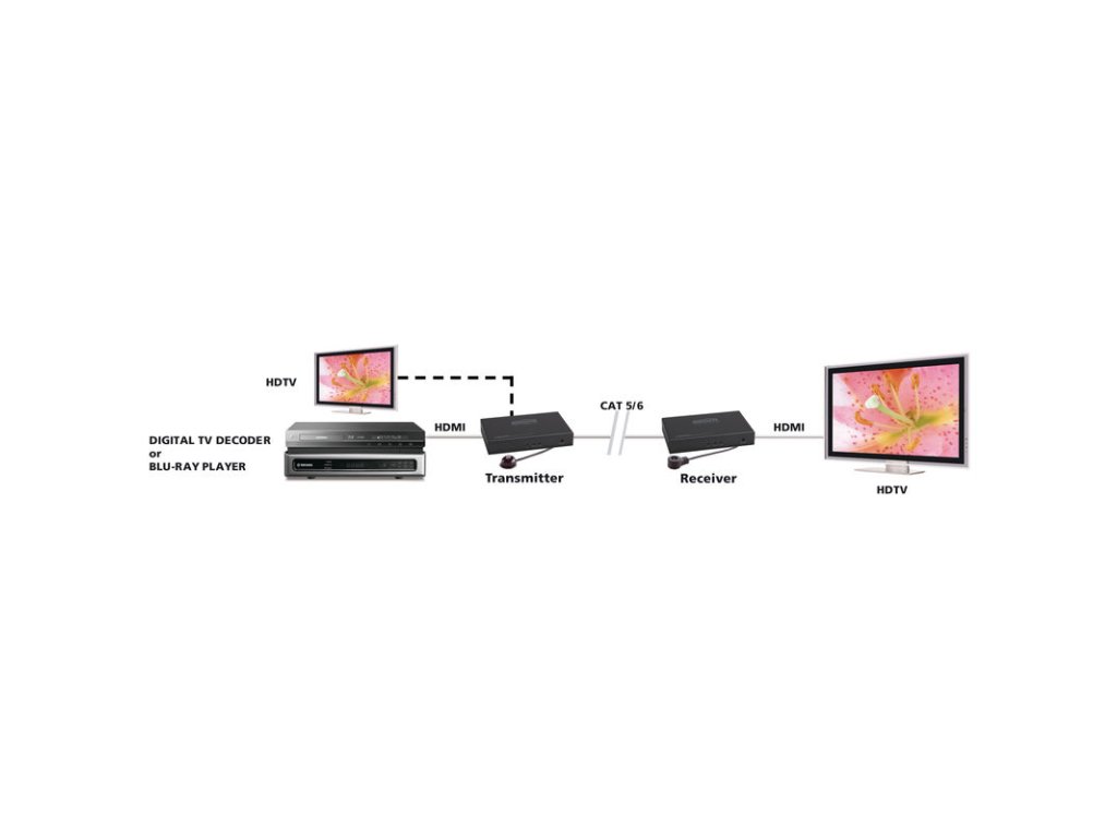 - Umožňuje preddĺžiť HDMI signál cez CAT5e/CAT6 kábel až na 100m.