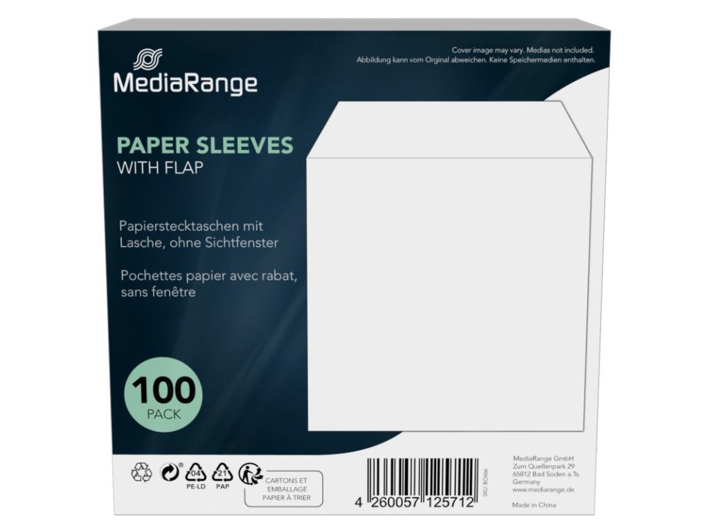 Papierové obaly MediaRange sú cenovo výhodným riešením pre úsporné skladovanie vašich optických médií. Klopa umožňuje rýchle balenie diskov a ich ochranu pred prachom a nečistotami.
