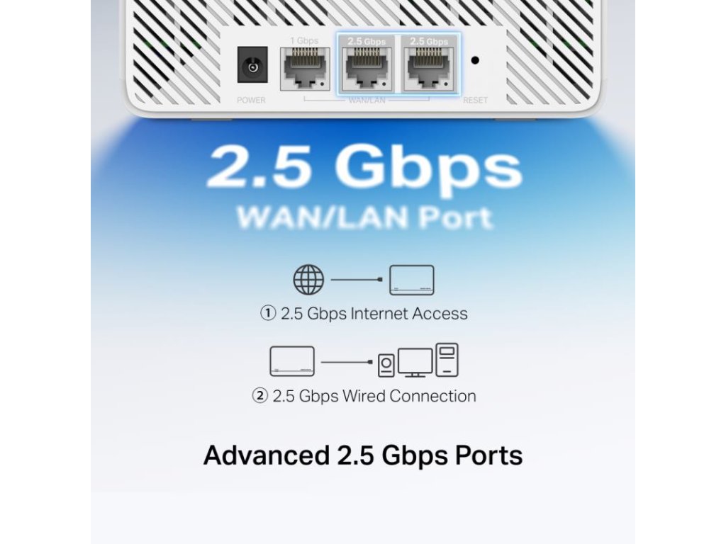 Porty 2.5G: Dva 2.5 Gbps WAN/LAN auto-sensing porty prekonávajú 1G úzke miesto, čo zabezpečuje maximálny výkon vašich zariadení.