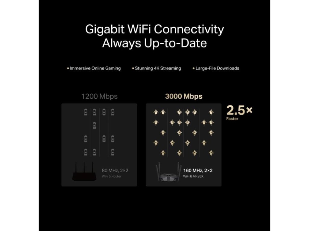 Mercusys MR85X je navrhnutý pre moderné domácnosti s množstvom pripojených zariadení, poskytujúc rýchle a stabilné pripojenie pre streamovanie videa, online hranie a prácu z domu.