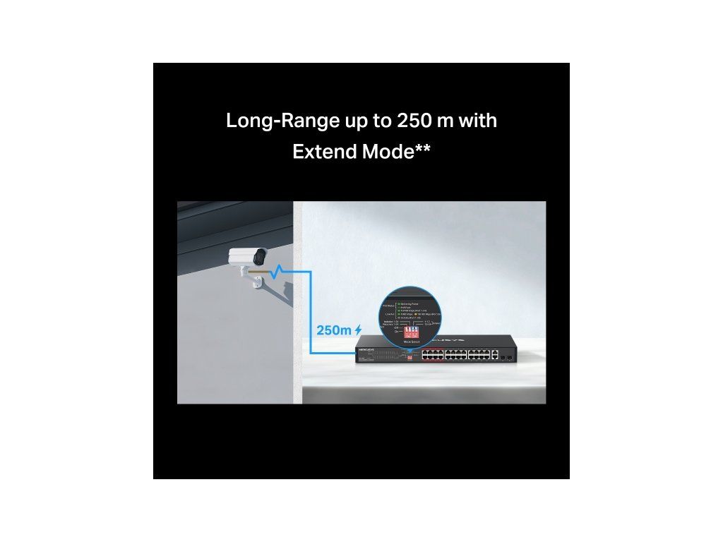 Dosah až 250 metrov: Potrebujete inštalovať kamery na veľké vzdialenosti? Jednoducho aktivujte Extend Mode a predĺžte dosah PoE napájania aj dátového prenosu až na 250 metrov.