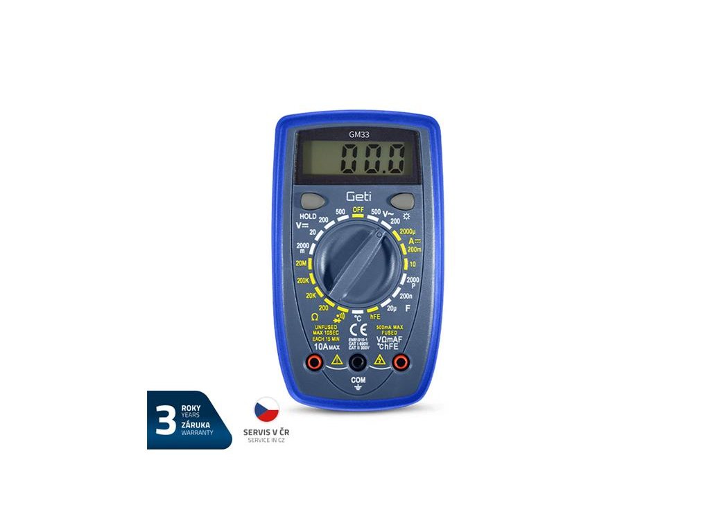 Na tento výrobok poskytujeme 3 roky záruku.Multimeter GETI GM33A nájde svoje uplatnenie pri meraní širokej škály elektrických veličín ako sú napríklad: napätie (DCV a ACV), prúd (DCA), odpor, kapacita a mnoho ďalších. Prehľadný displej doplnený o podsvietenie, zaisťuje ľahkú a presnú čitateľnosť nameraných hodnôt aj za horších svetelných podmienok. Prístroj je tiež vybavený ďalšími praktickými funkciami, ako je indikácia slabej batérie, ochrana proti preťaženiu, testovanie diód, meranie kontinuity alebo testovanie tranzistorov, ktoré dodávajú multimetru užívateľsky prívetivý charakter, ktorý vďaka kompaktným rozmerom a nízkej hmotnosti zaručuje ľahkú manipuláciu aj v ťažko prístupných miestach. Všetky tieto vlastnosti z tohto prístroja robia všestranného pomocníka, nielen v dielňach, ale aj domácnostiach.