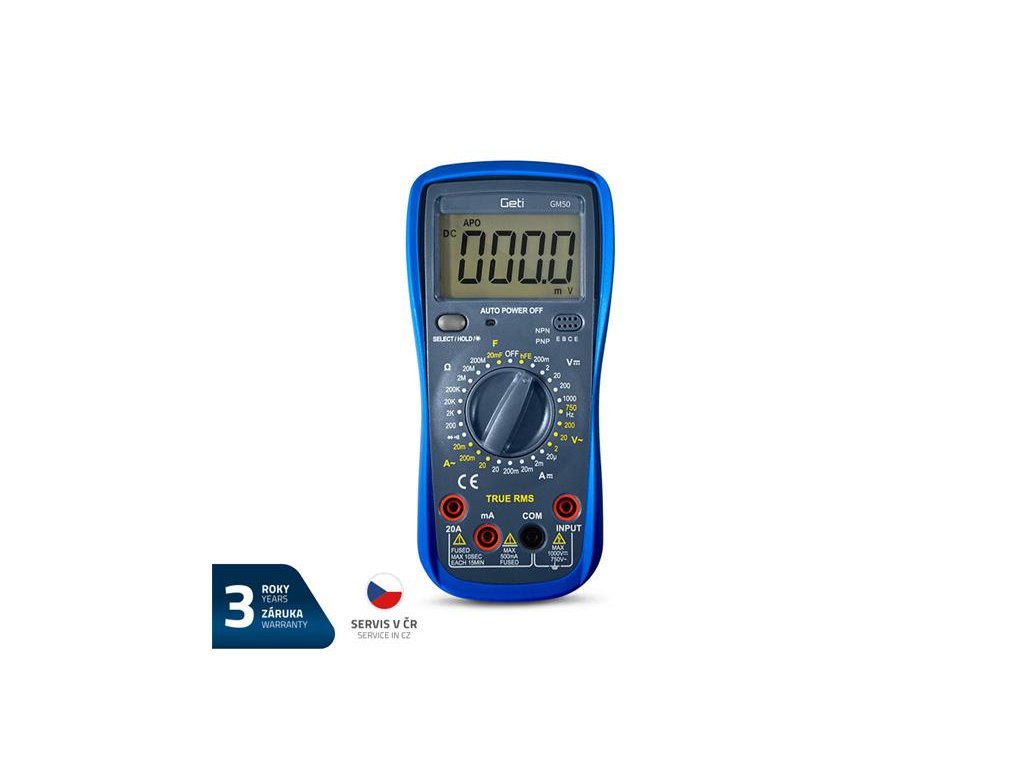 Na tento výrobok poskytujeme 3 roky záruku.Multimeter GETI GM50D je profesionálny prístroj vhodný na meranie širokej škály elektrických veličín ako sú: napätie (DCV a ACV), prúd (DCA a ACA), odpor, kapacita a ďalšie. Veľký a podsvietený displej, zaisťuje ľahké a dokonalé čítanie zobrazených údajov aj za zhoršených svetelných podmienok. Prístroj je tiež vybavený ďalšími praktickými funkciami, ako je indikácia slabej batérie, ochrana proti preťaženiu, testovanie diód alebo meranie kontinuity, ktoré dodávajú multimetru užívateľsky prívetivý charakter. Vďaka svojmu tvaru a kompaktným rozmerom zaručuje tento prístroj jednoduchú a presnú manipuláciu. Všetky tieto vlastnosti z tohto multimetra robia ideálny prístroj nielen pre profesionálov, ale aj dielne a domácnosti.