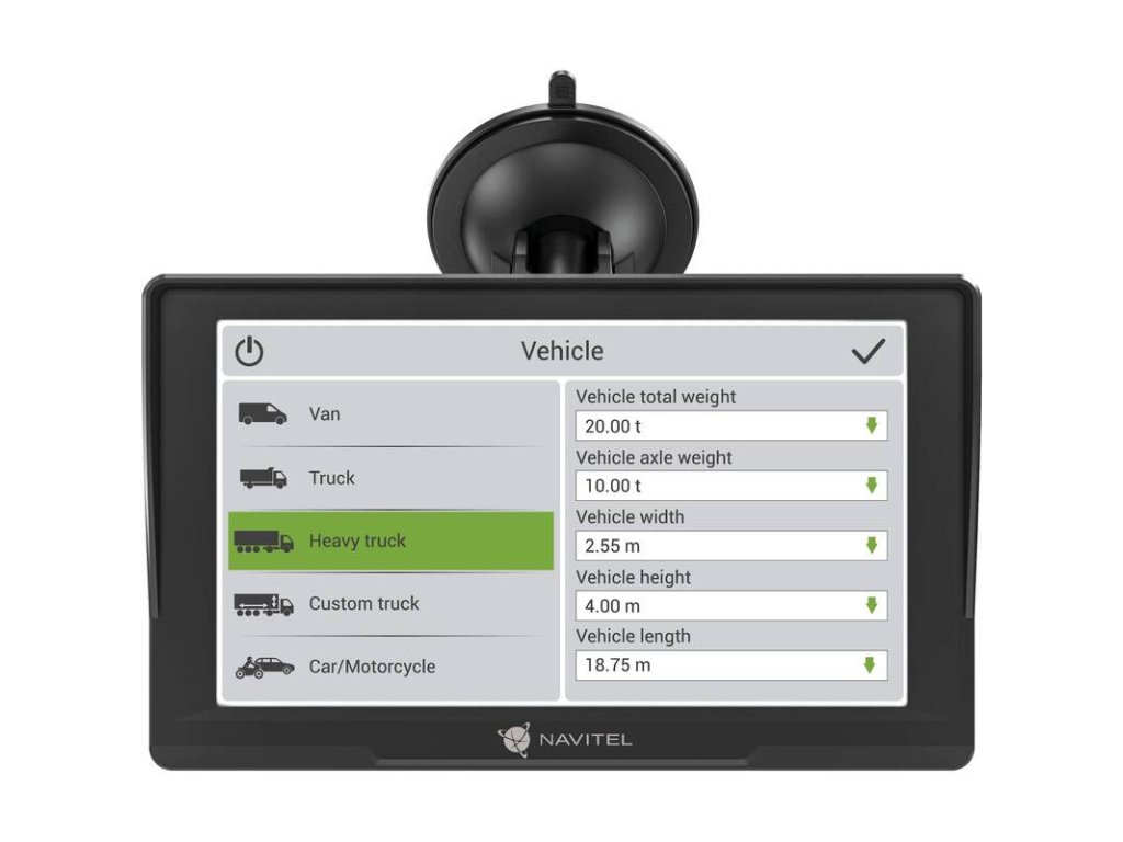 Tento model je vybavený rozšírenou sadou nastavenia pre navigáciu nákladných vozidiel . To znamená, že umožňuje v nastavení zvoliť konkrétny typ nákladnej dopravy aj vytvárať vlastné vozidlá pridaním jeho parametrov, ako je dĺžka, šírka, výška, maximálna povolená a skutočná hmotnosť, zaťaženie náprav a ďalšie . Na základe týchto parametrov je potom vypočítaná zodpovedajúca trasa s ohľadom na cestné obmedzenia.