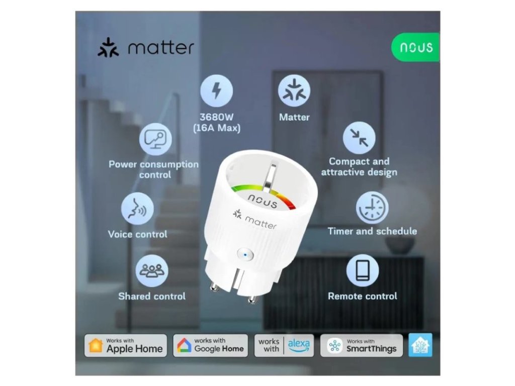 Inteligentná zásuvka Nous A8M Matter 16A (WiFi) je viac než len inteligentná zásuvka. Ide o inteligentný doplnok do domácnosti, ktorý dokáže premeniť vaše bežné elektrospotrebiče na inteligentné. Ide o inteligentné zariadenie pre domácnosť, ktoré vám môže pomôcť ušetriť energiu, peniaze a čas a zároveň zlepšiť vaše pohodlie a bezpečnosť. Môže tiež chrániť vaše zariadenia pred prepätím a chrániť váš dom pred potenciálnym požiarom, pretože je vyrobený z ohňovzdorných materiálov.
