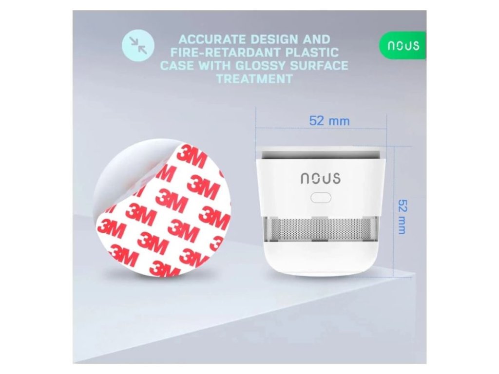 Fotoelektrický detektor dymu ZigBee Nous E8 deteguje požiar detekciou dymu. Keď dym v miestnosti dosiahne určitú koncentráciu, alarmový systém vydá zvukový a svetelný alarm. Tento poplašný systém je vhodný pre obytné budovy.