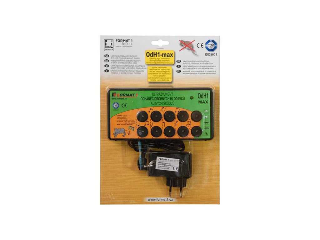 Zvukově-ultrazvukový elektronický odháněč myší, kun, krys, lasiček a potkanů. Jedná se o ryze český produkt s dlouholetou tradicí na trhu (od r. 1991) vyráběný přímo u nás ve firmě FORMAT1 spol. s r. o. Spolehlivý, výkonný, za dobu více jak 29 let ověřený mnoha zákazníky. Neškodný jak pro člověka a domácí hospodářská zvířata.Přístroj vytváří pro škůdce nepříjemné zvukové prostředí (v oblasti hranice slyšitelného zvuku a ultrazvuku), škůdci postupně opustí chráněný prostor. Přístroj je tedy naprosto humánní, nezabíjí zvířata, neškodí jim, pouze jim znepříjemní pobyt v chráněném prostoru, tedy je odhání. Nevyužívá žádných chemických přísad.