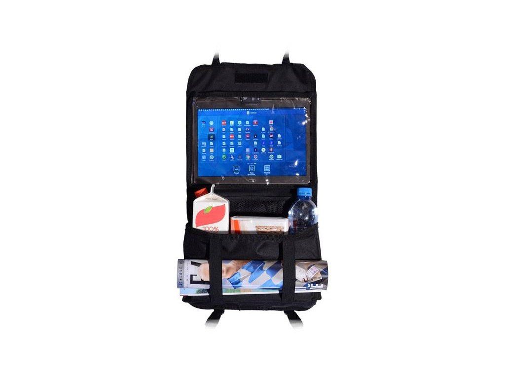 Organizér k připevnění na zadní stranu předního sedadla. Upevnění horní části pomocí popruhů za opěrku hlavy, spodní části popruhy za sedadlo.Organizér je vybaven celou řadou kapes a jednou velkou průhlednou kapsou (25 x 18cm), do které lze zasunout tablet až do velikosti 10.1“. Fólie na kapse umožňuje bezproblémové ovládání dotykových obrazovek.