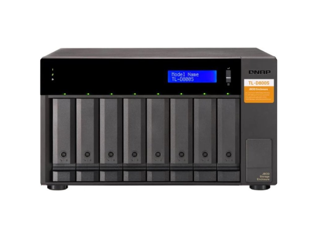 QNAP TL-D800S je vysoko výkonná 8-zásuvková stolná úložná jednotka typu JBOD (Just a Bunch of Disks) určená na rozšírenie úložnej kapacity pre QNAP NAS servery, Windows a Ubuntu počítače a servery