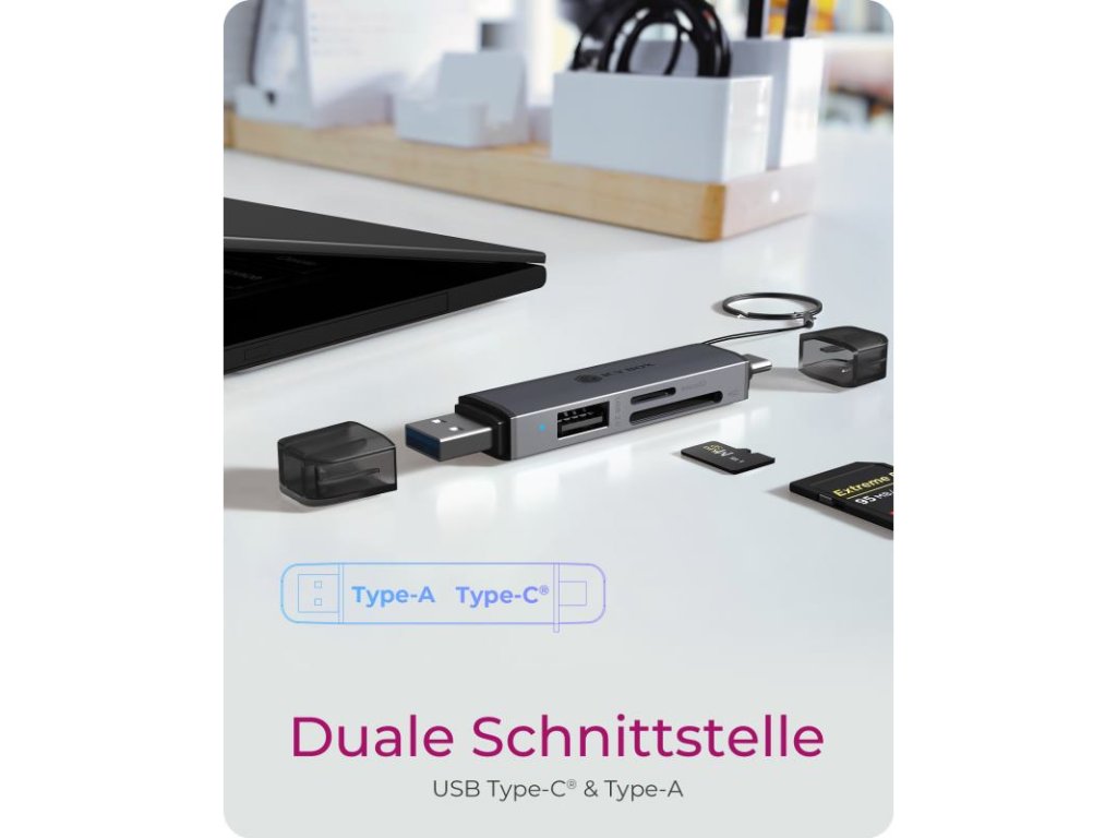 Čítačka pamäťových kariet: Podporuje najbežnejšie formáty kariet ako SD/SDHC/SDXC a microSD/microSDHC/microSDXC (až do štandardu UHS-I). S prenosovou rýchlosťou až 104 MB/s môžete rýchlo a efektívne sťahovať fotografie z fotoaparátu alebo zálohovať dáta. Nemusíte sa obávať problémov s kompatibilitou ? táto čítačka si poradí s rôznymi formátmi kariet.