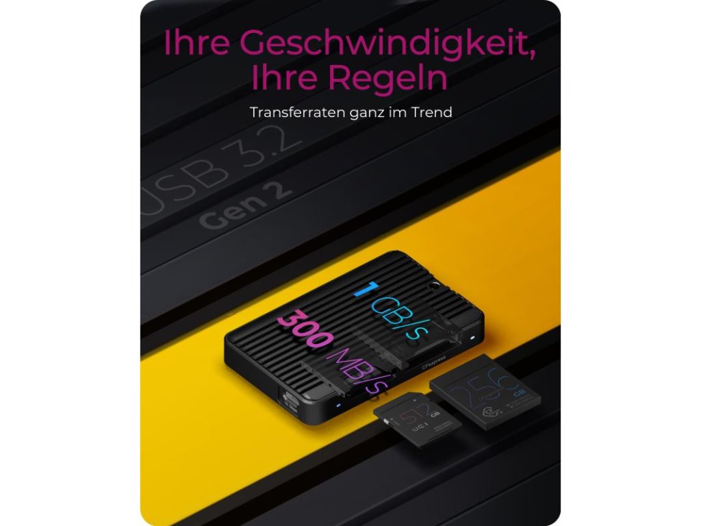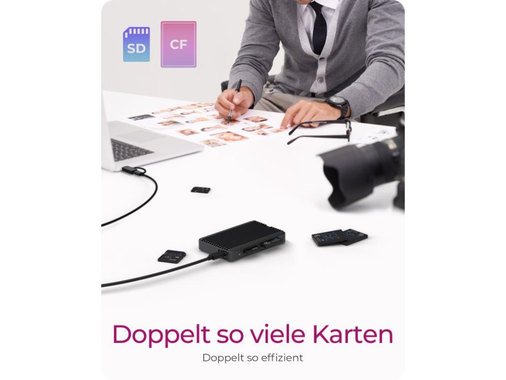 Vďaka technológii USB 3.2 môžete dosiahnuť rýchlosti prenosu dát až 1 GB/s pre CFexpress karty a až 300 MB/s pre SD UHS-II karty. To značne skracuje čas potrebný na zálohovanie alebo presúvanie veľkých súborov, čo je obzvlášť dôležité pri práci s 8K videom alebo vysokorozlíšením fotografií