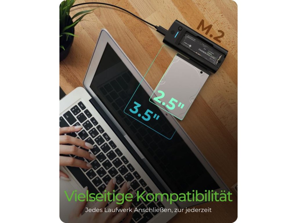Podporuje M.2 NVMe/SATA SSD a 3,5"/2,5" SATA III disky, čím poskytuje flexibilitu pri práci s rôznymi pamäťovými médiami. Táto prispôsobivosť vám umožňuje prispôsobiť váš úložný systém zmenám vašich potrieb a využívať širokú škálu typov diskov bez obmedzení.
