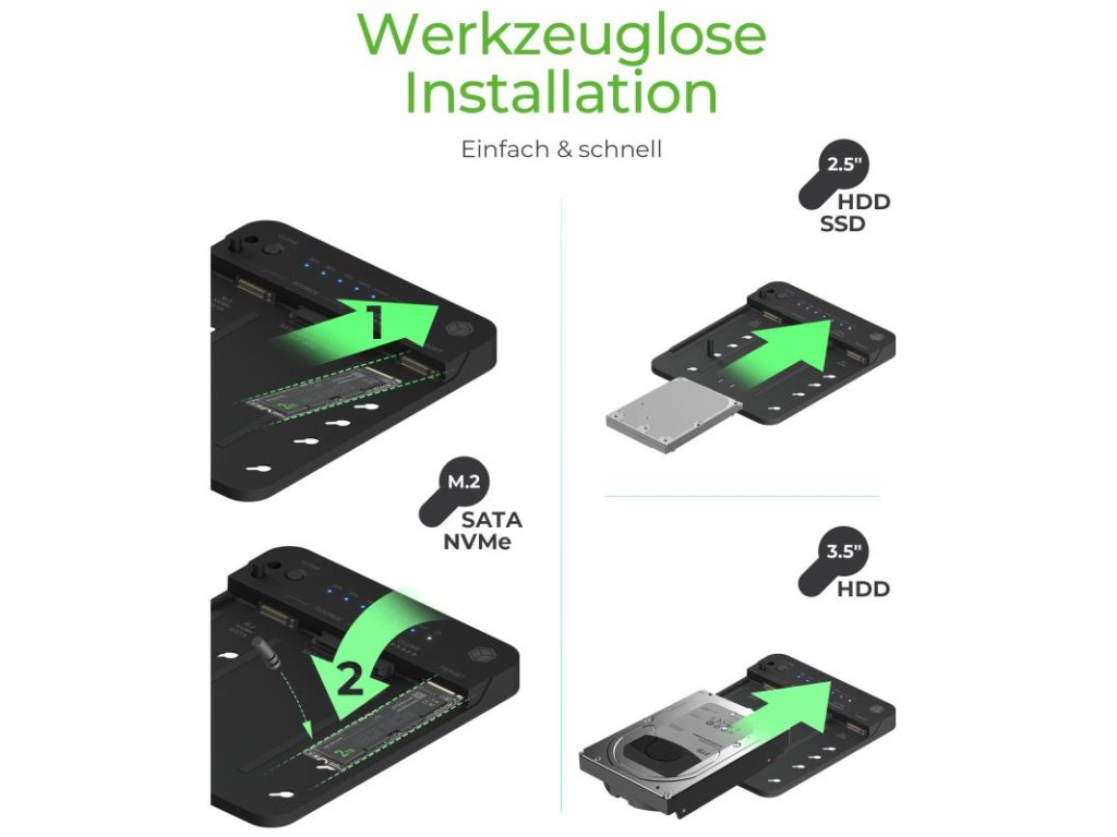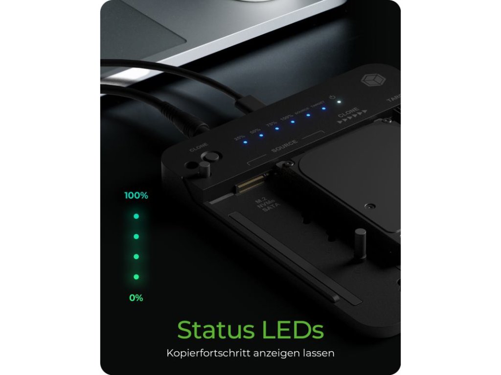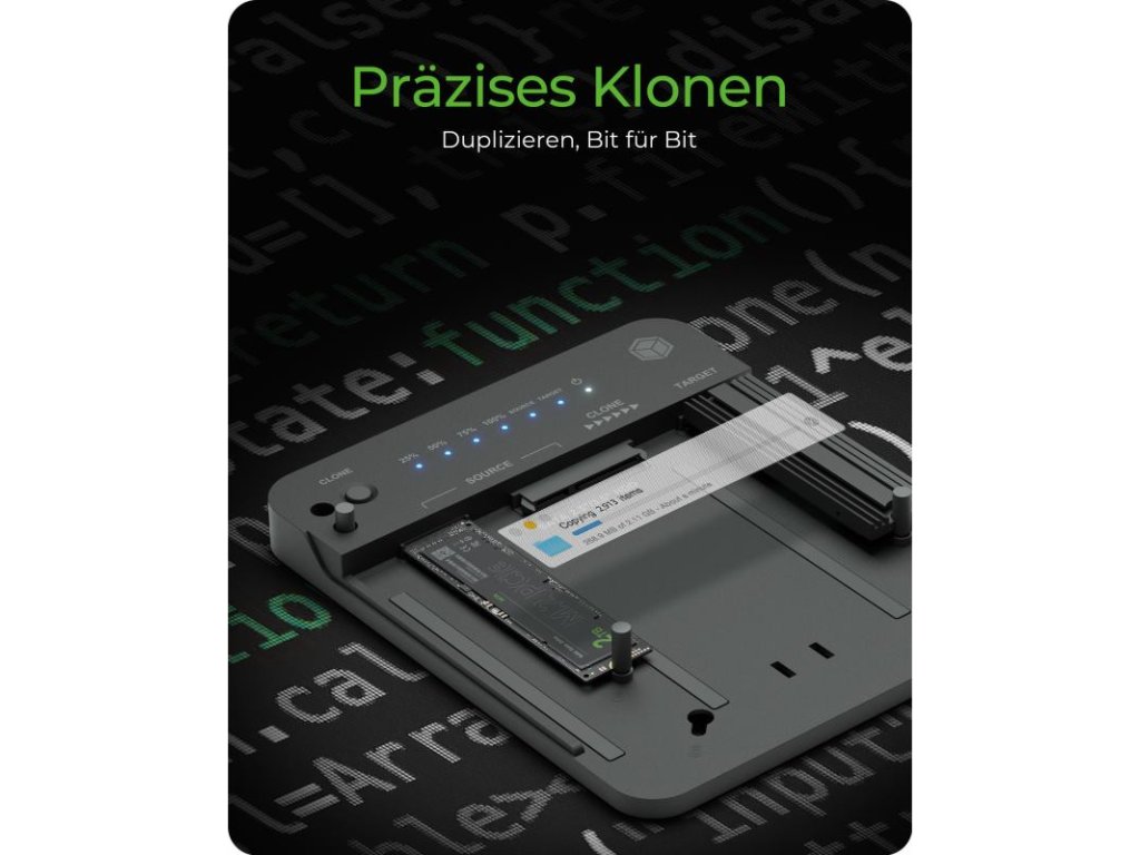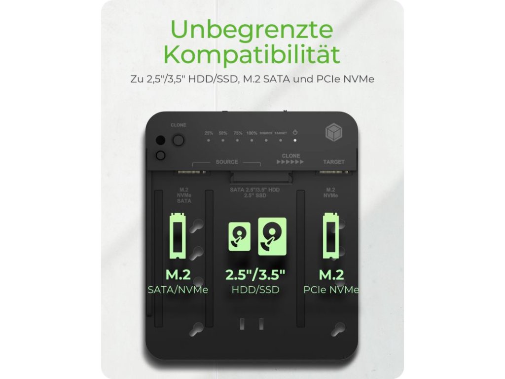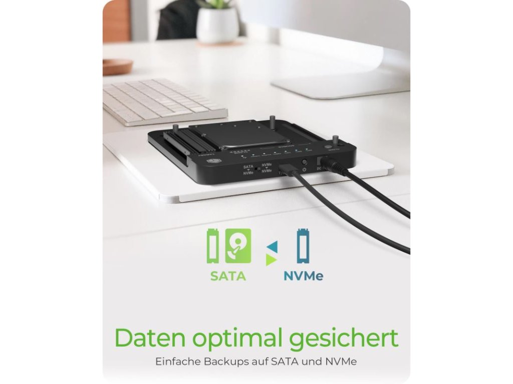 Neobmedzená kompatibilita: Stanica umožňuje jednoduché klonovanie z 2,5"/3,5" HDD/SSD alebo M.2 SATA SSD na cieľový M.2 PCIe NVMe SSD. Zrýchlite svoj systém alebo si zálohujte dáta jednoduchým stlačením tlačidla.