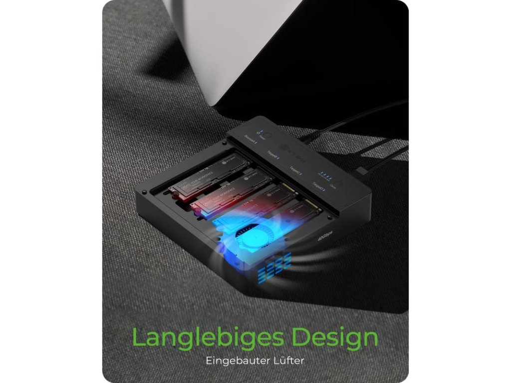 IB-4013MCL-C4 je moderná USB4 klonovacia stanica, určená pre 4x M.2 NVMe SSD, ktorá umožňuje efektívne offline klonovanie s pomerom 1:3. Stanica je navrhnutá tak, aby podporovala prenos dát na štyroch NVMe SSD jednotkách súčasne, pričom rýchlosť prenosu môže dosiahnuť až 40 Gbit/s vďaka rozhraniu USB4 Type-C. Každý SSD slot umožňuje prenosovú rýchlosť až 16 Gbit/s.
