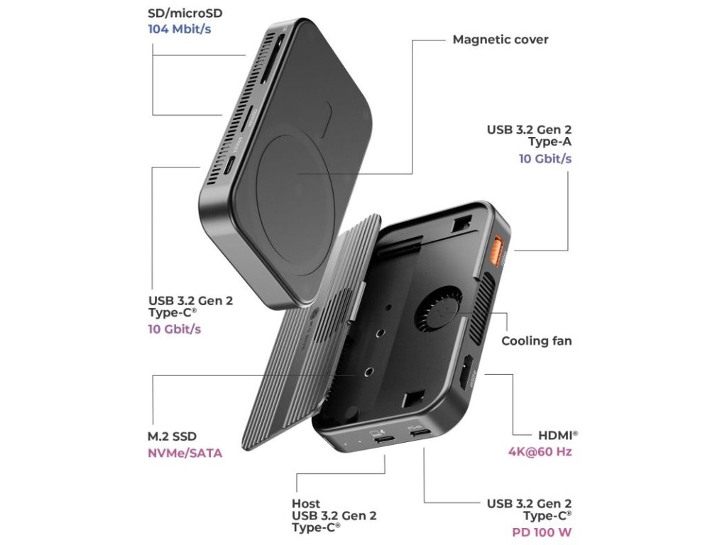 Dokovacia stanica obsahuje magnetický kryt, ktorý umožňuje jej bezpečné pripevnenie k zadnej strane vášho mobilného telefónu alebo iných kompatibilných zariadení. Je to obzvlášť praktické pre používateľov, ktorí potrebujú dodatočný úložný priestor na cestách, aby udržali svoj pracovný priestor bez neporiadku a mali svoj SSD disk ľahko prístupný.