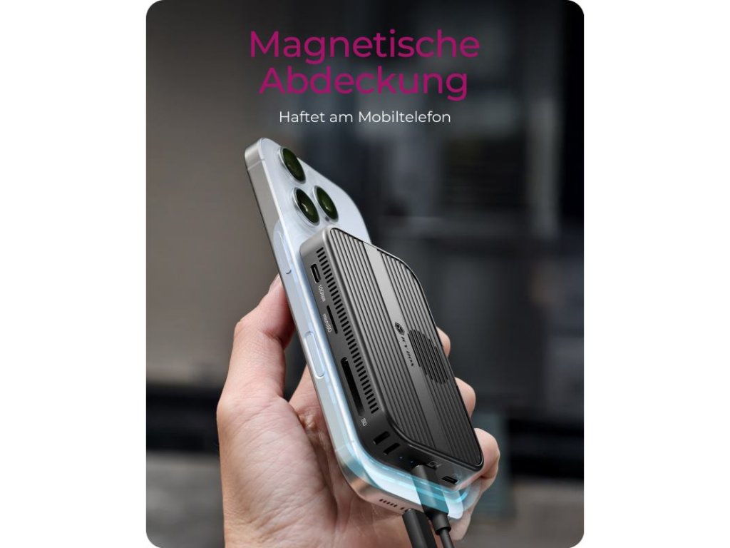 Magnetické uchytenie - Dokovacia stanica obsahuje magnetický kryt, pomocou ktorého ju možno bezpečne pripevniť k zadnej strane vášho telefónu alebo iných kompatibilných zariadení. Je to obzvlášť praktické pre používateľov, ktorí potrebujú dodatočný úložný priestor počas cestovania.