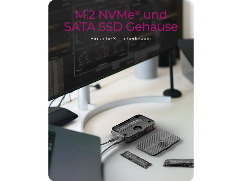 M.2 NVMe a SATA - Táto dokovacia stanica kombinuje výkonné pripojenie s rýchlym externým úložiskom prostredníctvom integrácie vysokorýchlostného puzdra pre M.2 NVMe a SATA SSD disky. Podporuje kapacity až do 8 TB a predstavuje praktické riešenie pre správu veľkých súborov, zálohovanie údajov alebo mediálnych knižníc - to všetko z jedného kompaktného multifunkčného zariadenia na vašom pracovnom stole.