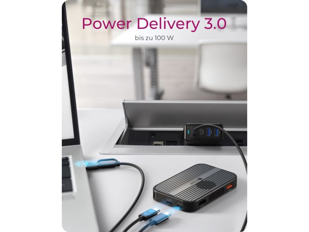 Power Delivery 3.0 - Zostaňte napájaní počas celého dňa vďaka USB Typ-C PD-IN portu s podporou až 100 wattov. Stačí pripojiť váš USB Typ-C napájací adaptér na nabíjanie dokovacej stanice a pripojených zariadení bez potreby ďalších adaptérov alebo preťažovania pracovného priestoru.