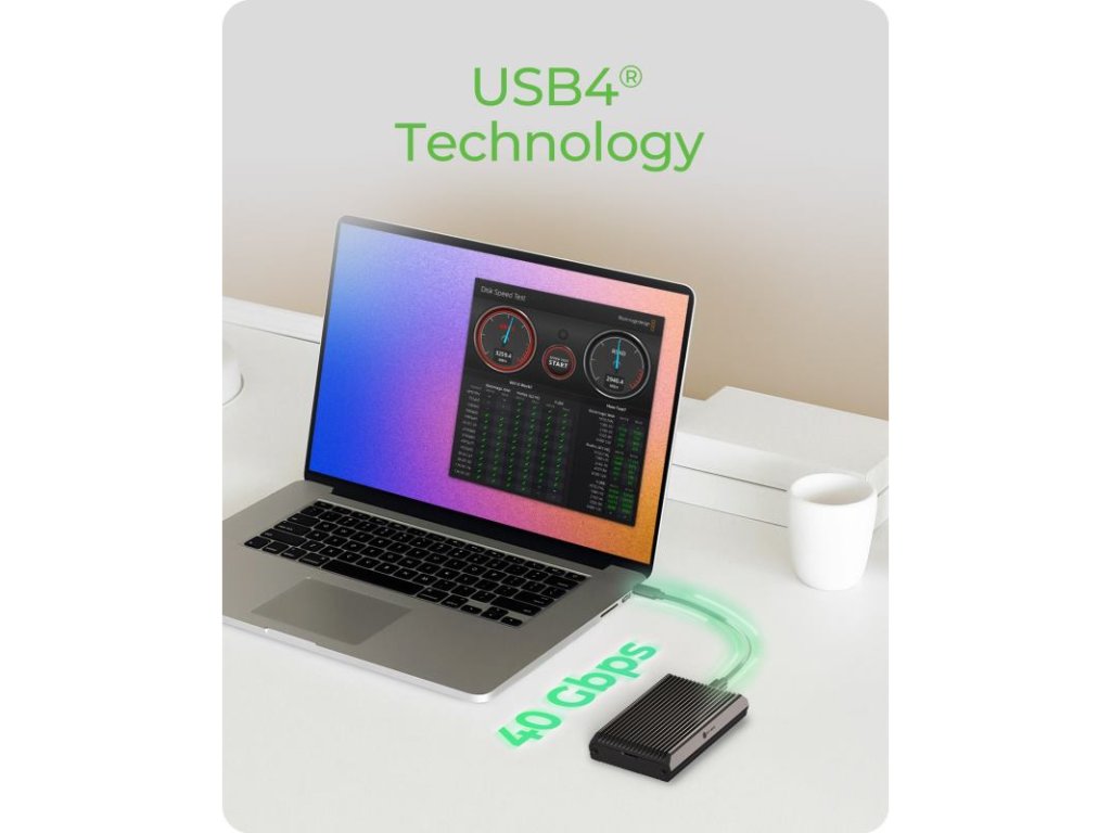 Vďaka najmodernejšej technológii USB4 Gen 3x2 dosiahnete prenosovú rýchlosť až 40 Gbit/s. Potrebujete presunúť veľké súbory? S týmto boxom skopírujete 10 GB dát za menej ako sedem sekúnd. Je to ideálne riešenie pre prácu s videom v 8K rozlíšení, rozsiahlymi dátovými súbormi a ďalšími náročnými úlohami, kde je každá sekunda dôležitá.