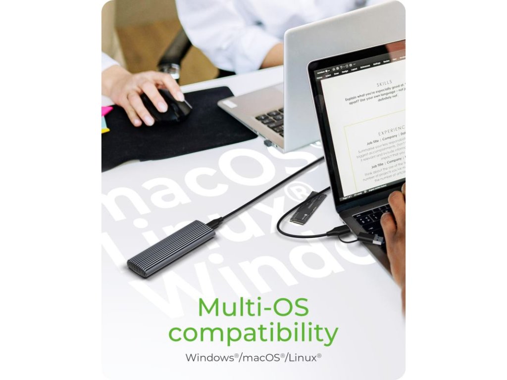 Už nemusíte kupovať viacero boxov pre rôzne typy diskov. Tento model je kompatibilný s M.2 SSD diskami NVMe (PCIe) aj SATA (AHCI). Vďaka podpore rozhraní B-Key a B+M Key vám poskytuje maximálnu flexibilitu a šetrí starosti s výmenou boxov.