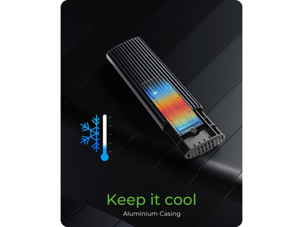 Hliníkové puzdro je navrhnuté pre stabilný výkon a funguje ako chladič. Spolu s priloženou 2 mm hrubou teplovodivou podložkou zaisťuje vynikajúci odvod tepla. Aj pri vysokej záťaži tak zostávajú teploty v optimálnom rozmedzí, čo chráni váš SSD pred spomalením alebo poškodením v dôsledku prehriatia.