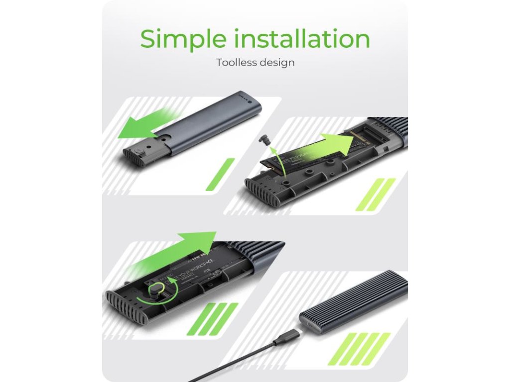 Zabudnite na skrutky a ďalšie nástroje. Inštalácia je rýchla a jednoduchá v štyroch krokoch: otvorte puzdro, vložte SSD, priložte teplovodivú podložku a zatvorte. Váš disk bude pripravený na prenos dát za okamih, či už disk vylepšujete, alebo len vymieňate.