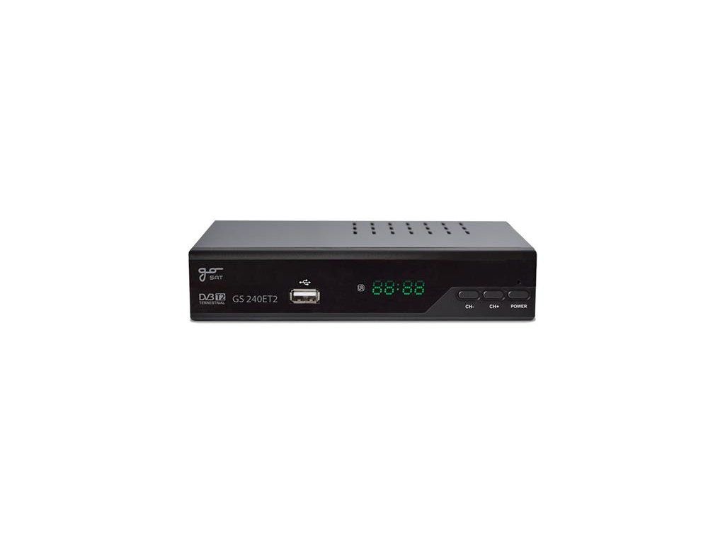 Model GS240E na rozdiel od pôvodnej verzie neobsahuje internetové funkcie (Youtube, RSS, počasie).Set-top box GoSAT GS240ET2 je inovovaný model prijímača televízneho DVB-T2 vysielania. Oproti predchádzajúcim modelom umožňuje jednoducho zálohovať nastavenia na USB, alebo využiť možnosť časovača zapnutia a vypnutia. Samozrejmosťou zostáva programovateľný diaľkový ovládač pre jednoduchú obsluhu základných funkcií Vášho televízora. Vzhľad OSD menu je teraz jednoduchší a lepšie čitateľný najmä v prítmí, taktiež je možné upraviť jas displeja na prednom paneli.