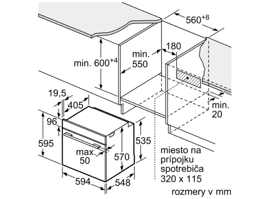 Požadovaná veľkosť otvoru na inštaláciu (v x š x h): 585-595 x 560-568 x 550 mm