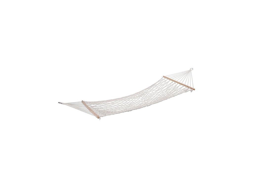 Outdoorová hojdacia sieť, upevniteľná pomocou dvoch závesných krúžkov.Sieť je na oboch koncoch osadená drevenými, rozpernými tyčami, ktoré zaisťujú vynikajúcu stabilitu as ňou spojenú vysokú mieru pohodlia. Tyčami sú pretiahnuté 5 mm povrazmi z mäkkého a pružného vlákna a konce povrazov sú zapletené do oceľových krúžkov určených na zavesenie.