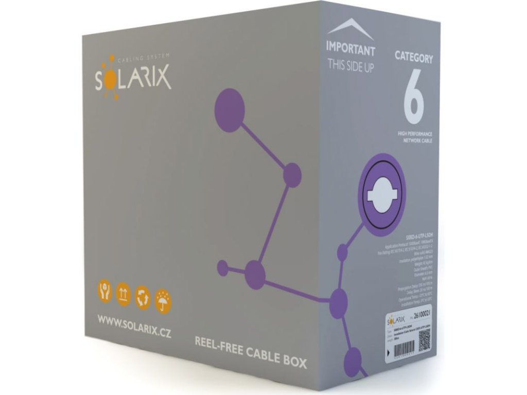 Vodiče týchto káblov sú vyrobené z veľmi kvalitného medeného drôtu vo veľkosti AWG 23. Jednotlivé páry sú oddelené plastovým krížom. Rovnako ako ostatné káble Solarix, je aj kábel SXKD-6-UTP-LSOH značený metráží po 1m v rozsahu od 0 do 305m. Kábel je dodávaný vo vysoko odolnom trojvrstvovom leštenom kartónovom boxe, na ktorom sú uvedené všetky potrebné produktové informácie, vrátane čiarových kódov, výrobné šarže, popisu a najdôležitejších technických parametrov.