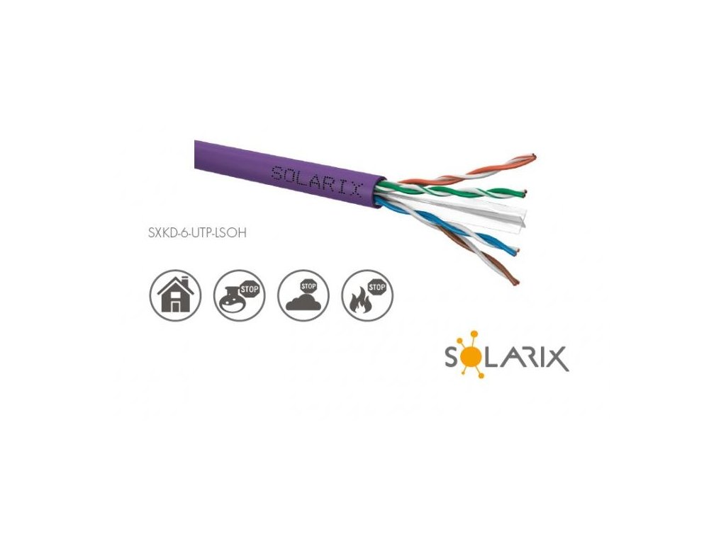 Tento inštalačný kábel z produktovej rady Solarix - kategórie 6 s označením SXKD-6-UTP-LSOH je vysoko kvalitný kábel určený pre horizontálne rozvody štruktúrovanej kabeláže, ktorý bez problémov spĺňa a tiež prevyšuje požiadavky špecifikované v medzinárodných štandardoch ANSI / TIA 568, ISO / IEC 11801 a EN 50173 pre kategóriu 6 a triedu vedenie Class E, vrátane všetkých najnovších dodatkov. Káble Solarix - kategórie 6 sú dodávané vo tienené aj netienené verzii s rôznym typom plášťa - tj. PVC (trieda reakcie na oheň E ca ), LSOH (trieda reakcie na oheň E ca ) alebo UV stabilný PE (trieda reakcie na oheň F ca).