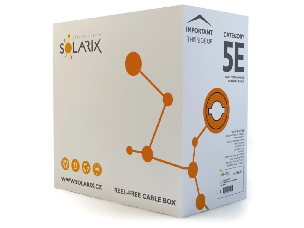Tieto káble bez problémov spĺňajú požiadavky definované v medzinárodných štandardoch ANSI / TIA / EIA 568, ISO / IEC 11801 a EN 50173 pre kategóriu 5E a sú vhodné aj pre prenos dát rýchlosťou až 1 Gb / s (tj. Gigabitový Ethernet). Rovnako ako ostatné káble Solarix, je aj kábel SXKD-5E-FTP-PE značený metráží po 1m v rozsahu od 0 do 305m. Kábel je dodávaný vo vysoko odolnom trojvrstvovom leštenom kartónovom boxe (vždy farebne jednoznačnom podľa typu kábla), na ktorom sú uvedené všetky nevyhnutné produktové informácie vrátane čiarových kódov, výrobné šarže, popisu a najdôležitejších technických parametrov (napr. NVP v podobe QR kódu). Pri inštalácii do zeme odporúčame vždy použiť HDPE chráničku.