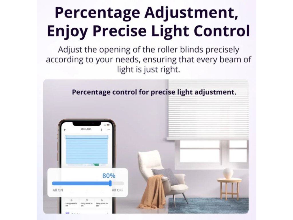 Presné polohovanie: Nastavíte si % otvorenia/zavretia, čo umožňuje jemnú reguláciu svetla a súkromia podľa potrieb.