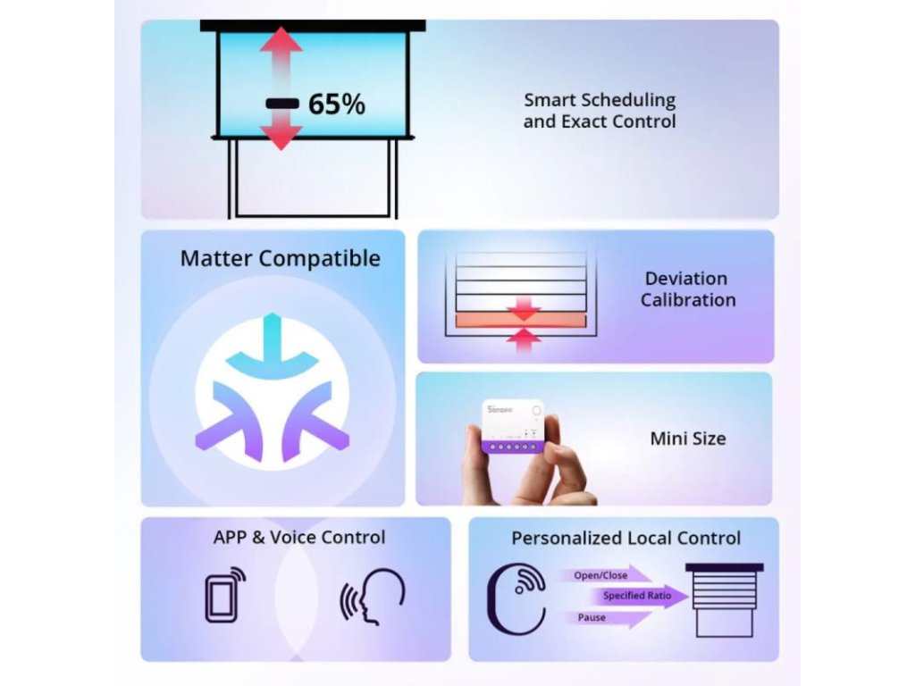SONOFF MINI‑RBS je ideálne riešenie pre tých, ktorí chcú modernizovať svoje rolety alebo závesy bez rekonštrukcie. Kompaktné riešenie s vynikajúcou integráciou do smart domácnosti cez Wi‑Fi, Matter a podporu širokého spektra platforiem robí z tohto modulu všestranný nástroj na inteligentný komfort a kontrolu.