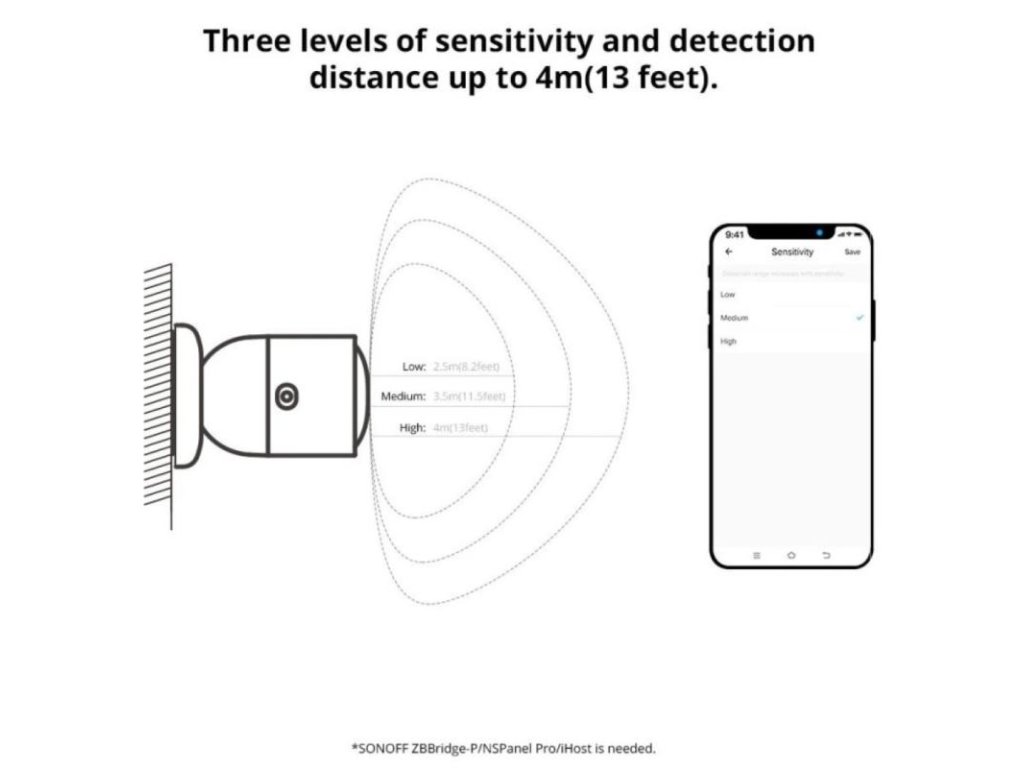 Senzor je možné nastaviť na 3 úrovne citlivosti. Toto sa tobí jednoduchým dvojitým stlačením tlačítka priamo na senzore. Senzor po dvojitom stlačení blikne 1, 2 alebo 3x podľa toho, v ktorej úrovni sa nachádza. Vy tak môžete vyladiť citlivosť tak, že detekcia je 2,5m až 4 metre. Toto nastavenie je možné robiť aj cez eWeLink aplikáciu.