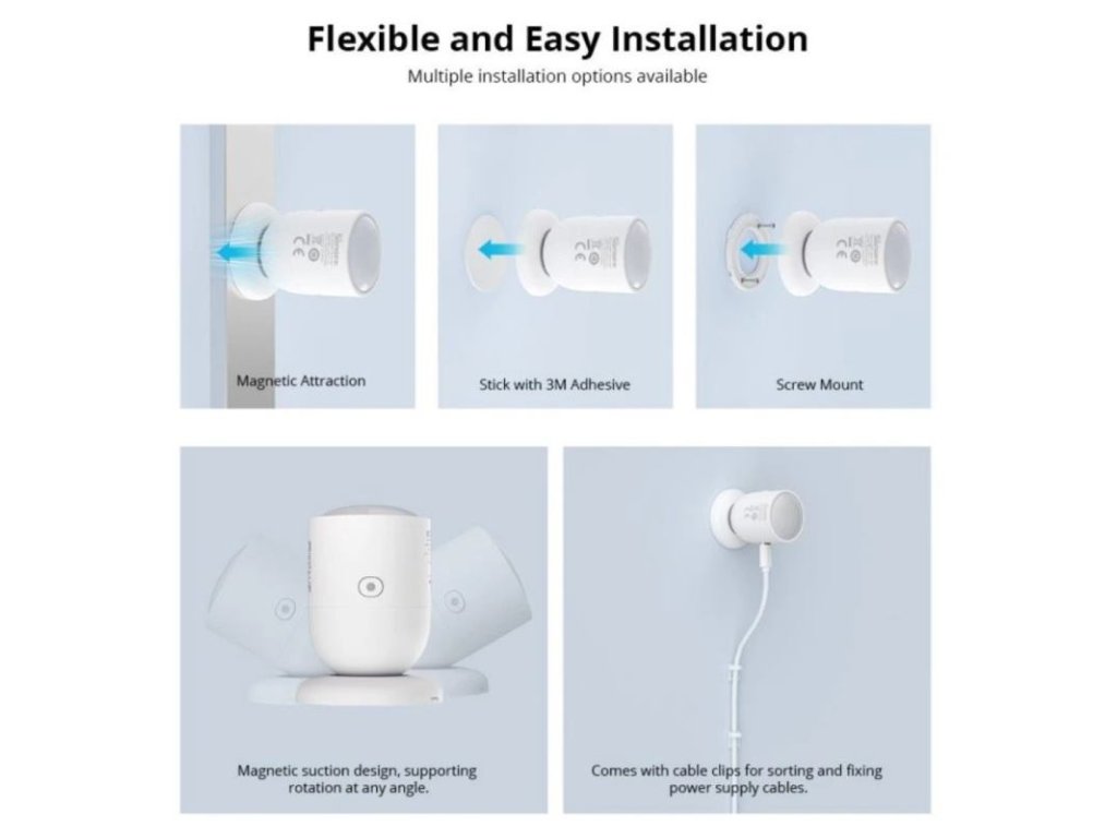 Vďaka magnetickému upevneniu ho následne môžete nasmerovať presne tak, ako potrebujete. Tento senzor, podobne ako iné senzory prítomnosti musí byť stále napájaný. Toto je zabezpečené pomocou USB-C adaptéru a kábla pribaleného v balení. Adaptér USB-C 2A na napájanie nie je súčasťou balenia.