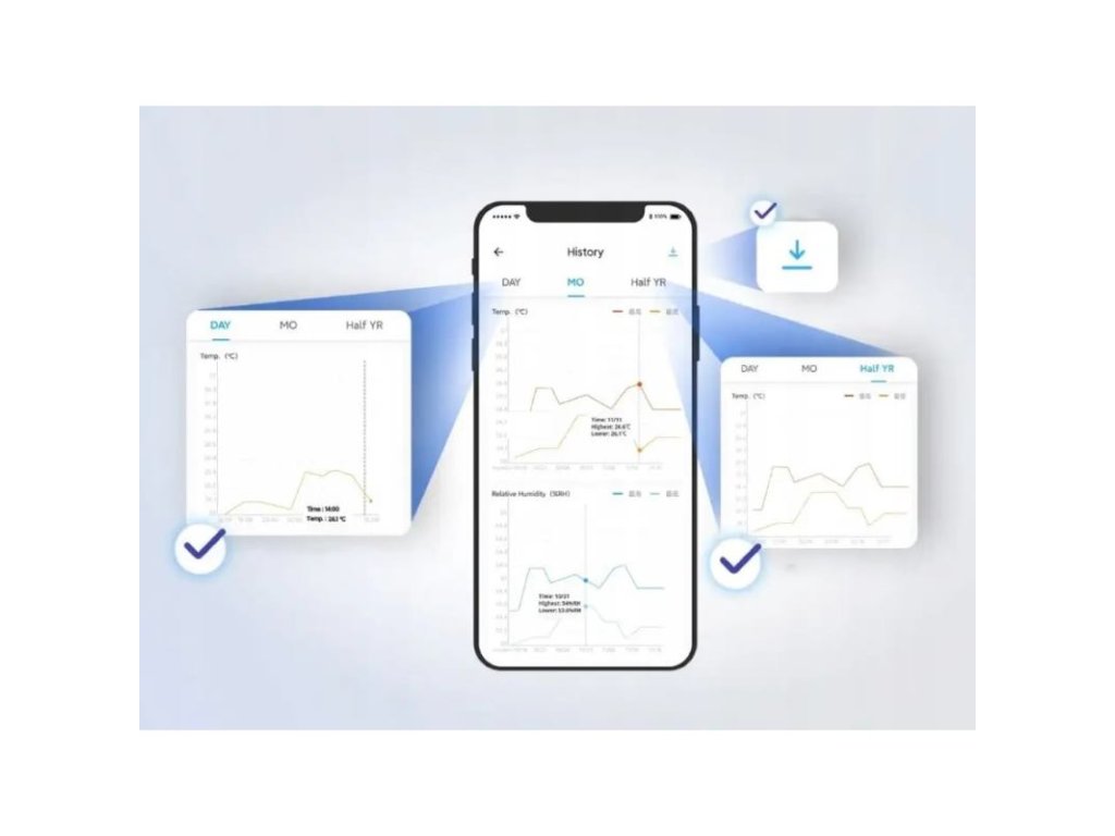 Vďaka podpore historických záznamov v cloude bude aplikácia ukladať údaje o teplote a vlhkosti za každý deň. Prostredníctvom dotazov v reálnom čase môžete ľahko získať prístup k zmenám teploty a vlhkosti za každý deň, mesiac alebo každých šesť mesiacov. Okrem toho môžete sťahovať údaje na zlepšenie prostredia na základe trendov teploty a vlhkosti.