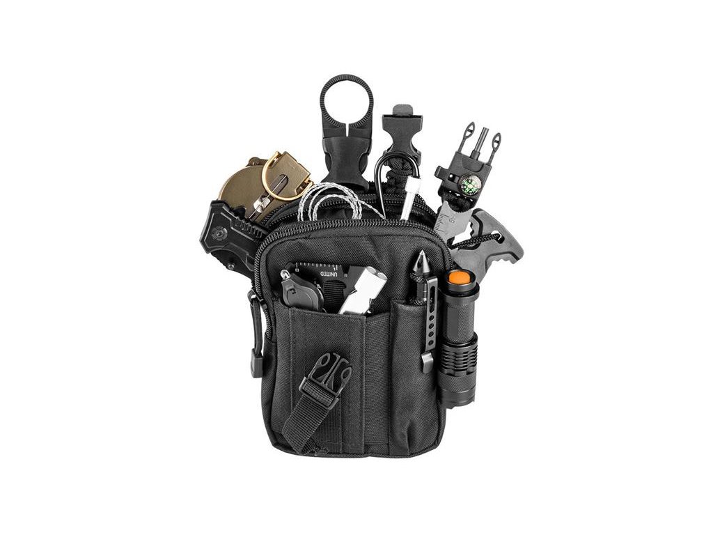 Sada na prežitie 14 v 1 v puzdre je sada skladajúca sa z kresadla s otváračom na fľaše, noža so skladacou čepeľou, svietidla, náramku na prežitie (s paracord lanom, kresadlom a kompasom), píšťalky, multifunkčné karty z nerezovej ocele ( obsahuje fľaše, otvárač na konzervy, pílku, očkový kľúč vo veľkostiach 4,5,6,7 mm, meter, plochý skrutkovač, nôž, paracordové lano), drôtenú pílku, taktické pero, sponu na fľaše, skladací kompas, 2 ks karabíny, mini svietidlo s krúžkom na kľúče, taška s prackami na opasok. Užitočné na rezanie, svietenie alebo osvetľovanie plôch, zakladanie požiaru, rozbíjanie okien v núdzových situáciách, ukladanie fľaše s vodou, kontrolu smeru. Odporúčané pre milovníkov prežitia, na cesty a kempovanie.Dodatočné parametre