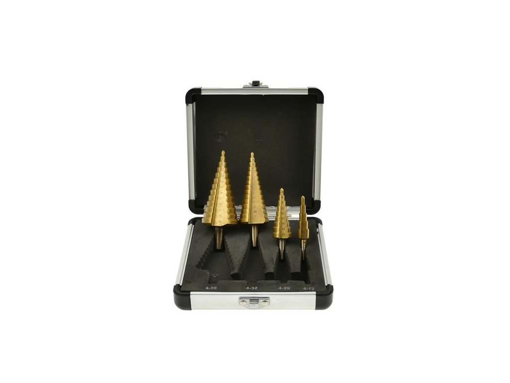 Súprava kužeľových vrtákov z HSS ocele s dodatočným titánovým povlakom od značky GEKO uložená v hliníkovom puzdre. Vrtáky odstupňované po 2 mm s valcovými stopkami a zreteľným číslovaním. Vhodné do kovov, tenkostenných oceľových plechov a plastov.kov
