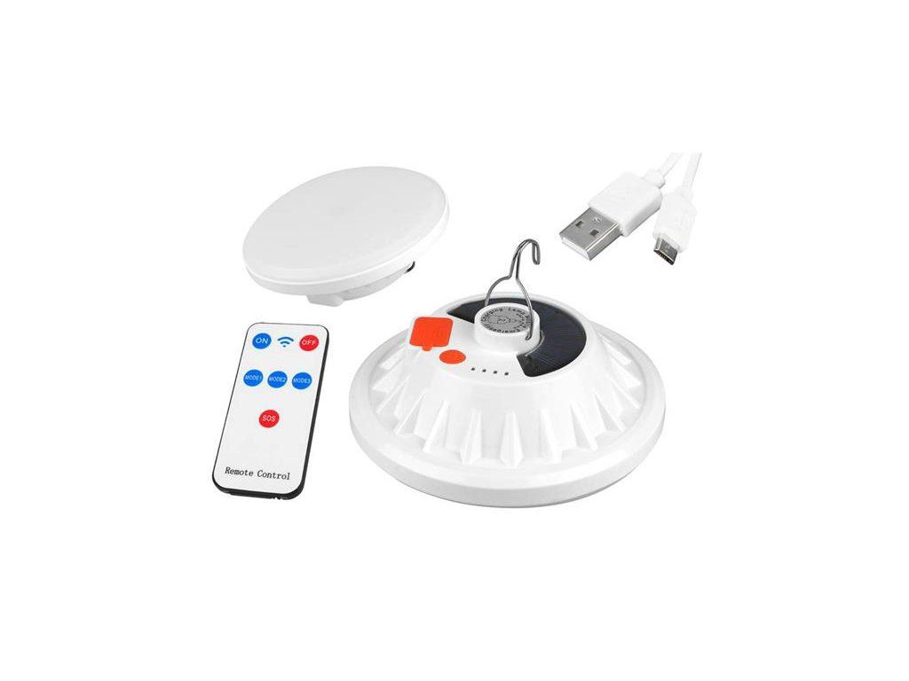 Funkčná kempingová lampa napájaná vstavanou batériou a solárnym panelom. Možnosť zavesenia do stanu (vstavané madlo). Je to silný zdroj svetla vďaka použitiu LED diód. Lampa je odolná proti prachu, nárazom a postriekaniu (IP65), bude úspešne fungovať vo vonkajších podmienkach. Má niekoľko režimov svietenia a nastaviteľný výkon svietenia. Vstavaný USB port umožňuje nabíjať ďalšie zariadenia (napr.)- Funkčná kempingová lampa napájaná vstavanou batériou a solárnym panelom