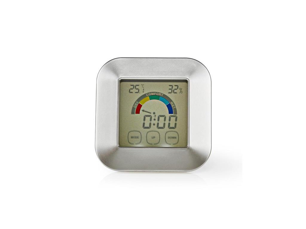 Jediným pohľadom na tento vlhkomer a teplomer získate všetky informácie o klíme v miestnosti. Zobrazuje vlhkosť v percentách a pomocou grafiky. Okrem toho zobrazuje tiež vnútornú teplotu a čas a obsahuje funkciu alarmu, ktorú môžete použiť ako časovač. Postavte ho na stojan alebo ho pripevnite pomocou magnetu na zadnej strane.Vlastnosti: