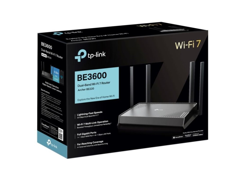 TP-Link Archer BE220 je pokročilý dvojpásmový Wi-Fi 7 router s kombinovanou rýchlosťou až 3,6 Gb/s, určený pre domácnosti s vysokými nárokmi na internet, streamovanie a online hry.