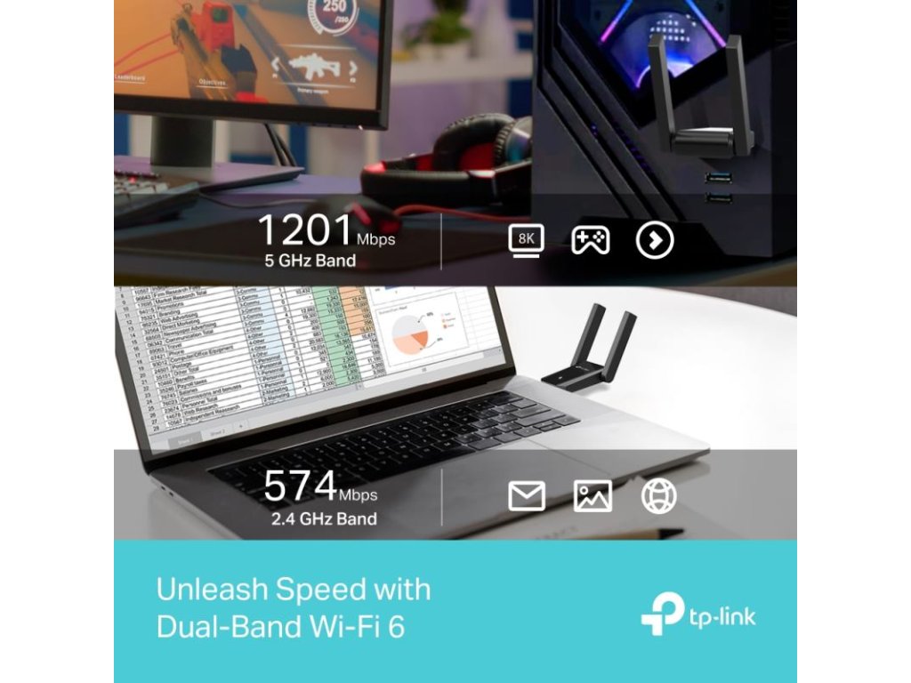 Rýchlosť bez hraníc: Wi-Fi 6 a duálne pásma umožňujú prenosové rýchlosti až 1800 Mbps, čo zabezpečuje plynulé a rýchle pripojenie.