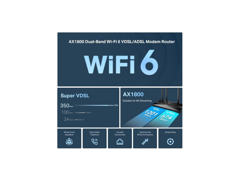 Archer VX1800v má vo výbave Super VDSL (VDSL2 Profile 35b) ? najnovšiu generáciu technológie DSL. Rýchlosť sťahovania dát sa vďaka tomu zvýšila až na 350 Mbit/s, čo je 3,5× viac ako u predchádzajúcej technológie VDSL2. Kompatibilita s poprednými poskytovateľmi internetových služieb znamená prakticky neobmedzené možnosti pripojenia na báze protokolu IP pre každú domácnosť. Integrovaný port DSL podporuje aj všetky štandardné pripojenia typu DSL.