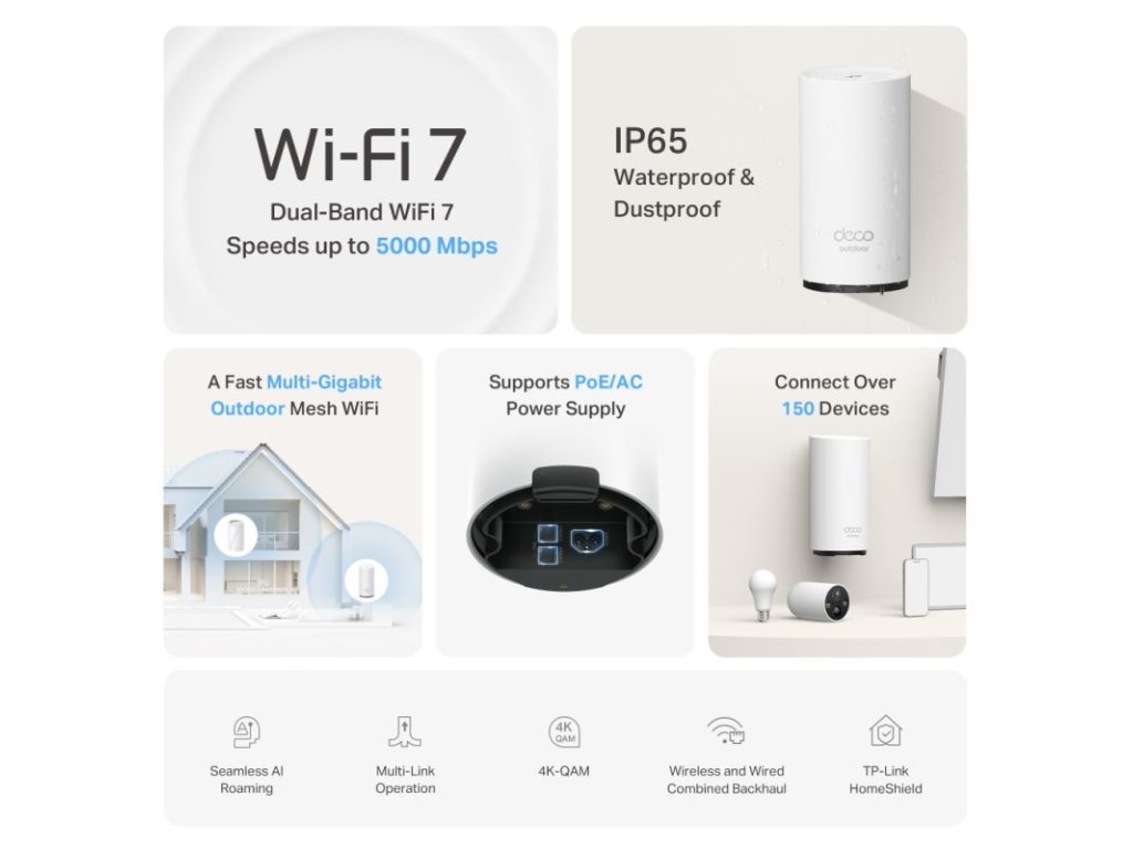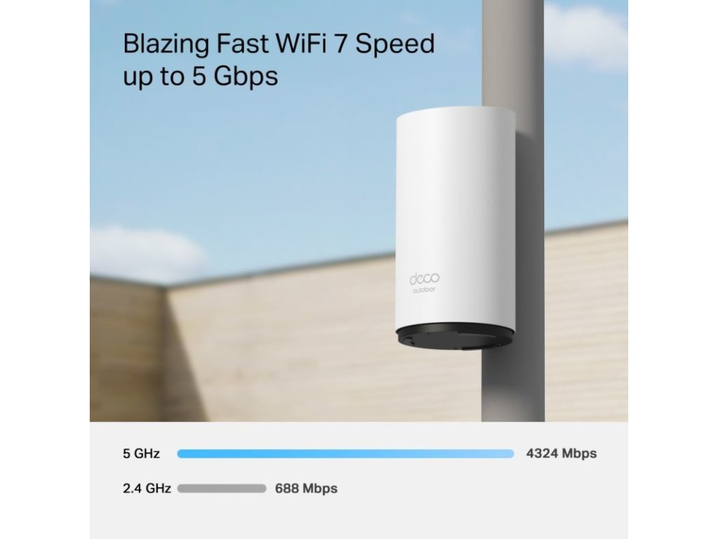 Deco BE25-Outdoor je výkonný mesh router novej generácie, ktorý poskytuje bezdrôtové pripojenie WiFi 7 pre vonkajšie a vnútorné prostredie. Je navrhnutý na pokrytie širokých priestorov a zabezpečenie stabilného pripojenia s vysokou rýchlosťou.
