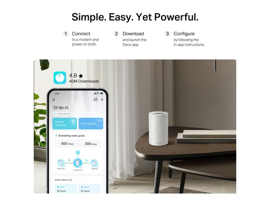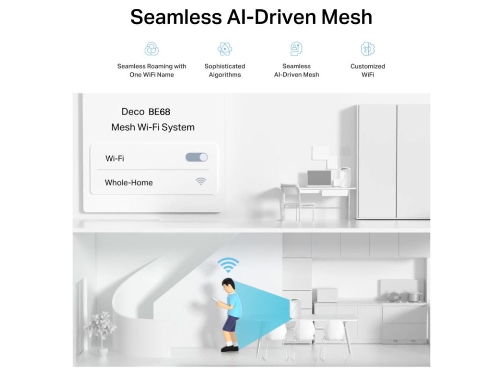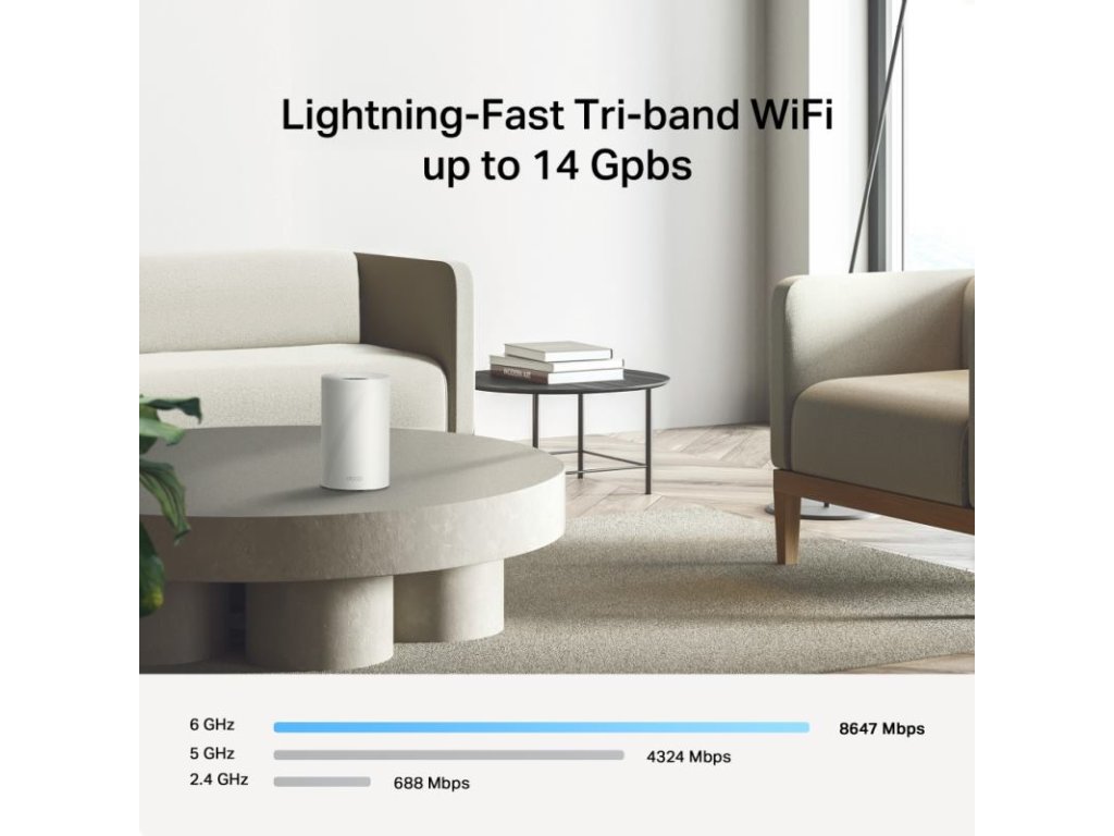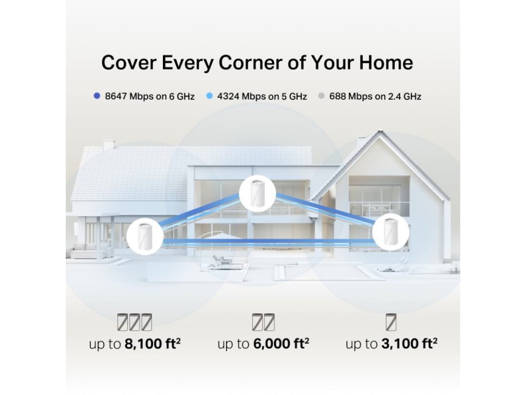 Pokrytie a dosah: Vďaka technológii TP-Link Mesh s umelou inteligenciou (AI-Driven Mesh) sa systém inteligentne učí prostredie vašej domácnosti a vytvára ideálnu WiFi sieť na mieru. O silný signál sa stará 8 interných antén s vysokým ziskom.
