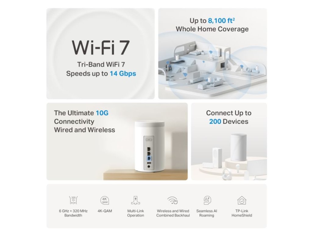 Extrémna rýchlosť WiFi 7: Systém ponúka kombinovanú rýchlosť až 14 Gbps v troch pásmach: