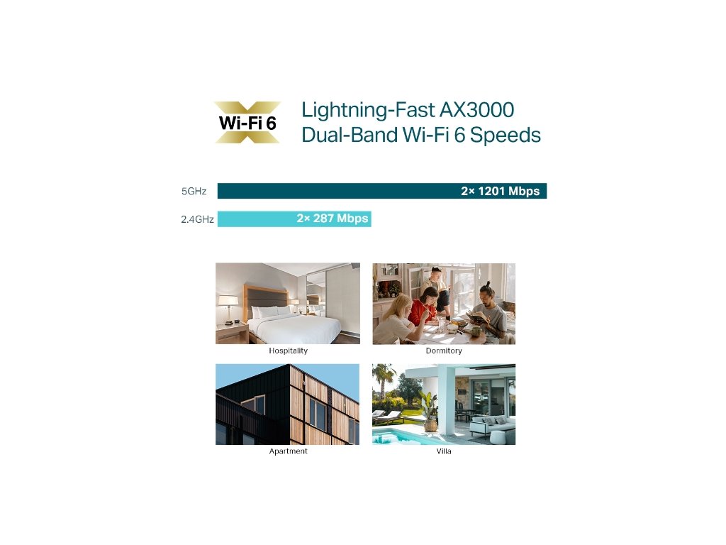 Bleskovo rýchly AX3000 WiFi 6 rýchlostí: Simultánne 574 Mbps na 2,4 GHz a 2402 Mbps na 5 GHz spolu 2976 Mbps WiFi rýchlosti.