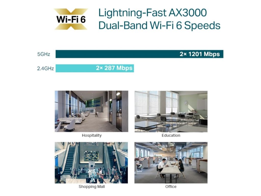 Ultra-rýchle WiFi 6 rýchlosti: EAP653 ponúka súčasný prenos dát s rýchlosťou 574 Mbps na frekvencii 2.4 GHz a 2402 Mbps na frekvencii 5 GHz, celkovo až 2976 Mbps.