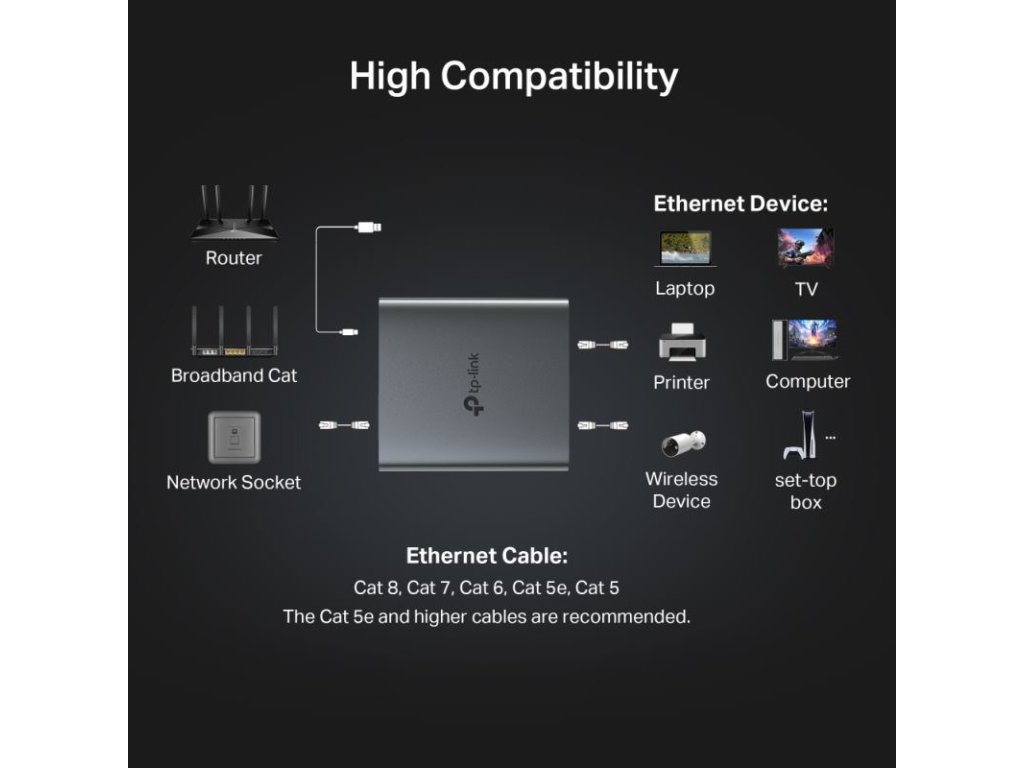 EH210 je kompatibilný s Ethernetovými káblami Cat 8/7/6/5e/5 a môže byť použitý s hubmi, prepínačmi, routermi, bezdrôtovými zariadeniami, počítačmi a ďalším zariadením.